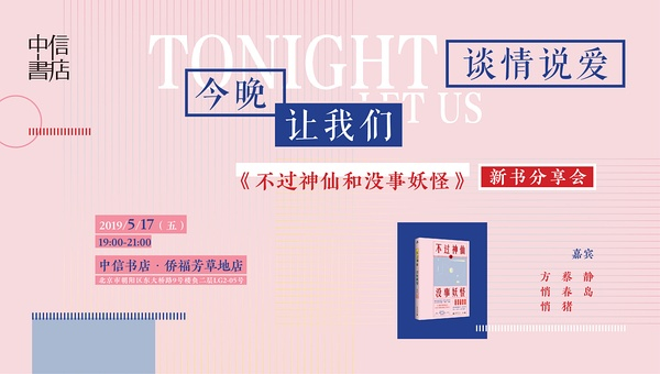5月17日晚,《不过神仙和没事妖怪》作者、豆瓣阅读“小雅奖”获奖者静岛,知名影视编剧蔡春猪,当代作家方悄悄将一起做客中信书店·侨福芳草地店,在这个初夏的夜,与你一起谈情说爱。
