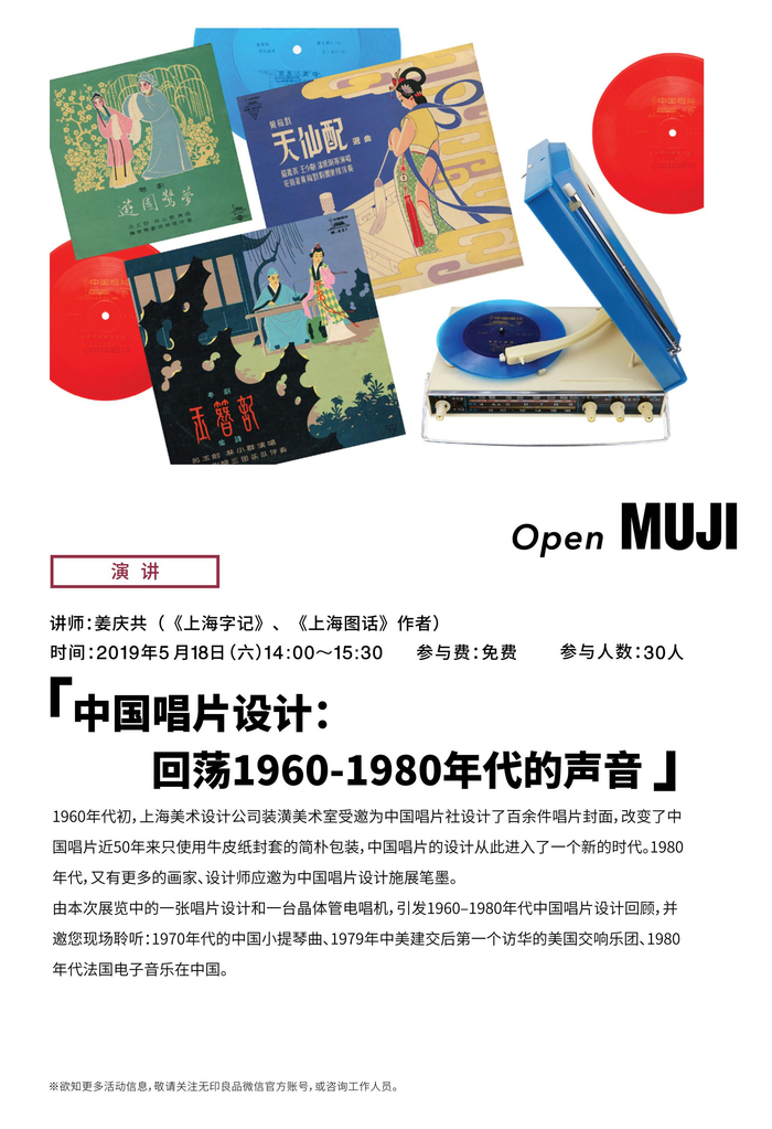 1960年代初,上海美术设计公司装潢美术室受邀为中国唱片社设计了百余件唱片封面,改变了中国唱片近50年来只使用牛皮纸封套的简朴包装,中国唱片的设计从此进入了一个新的时代。1980年代,又有更多的画家、设计师应邀为中国唱片设计施展笔墨。由本次展览中的一张唱片设计和一台晶体管电唱机,引发1960–1980年代中国唱片设计回顾,并邀您现场聆听:1970年代的中国小提琴曲、1979年中美建交后第一个访华的美国交响乐团、1980年代法国电子音乐在中国。