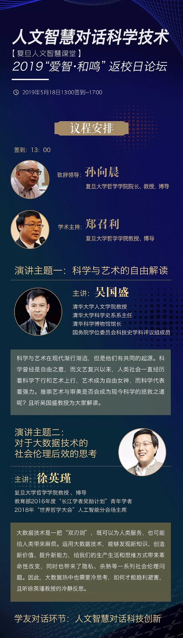 一年一度的复旦大学校友返校日论坛即将开启!此次返校日论坛希望通过人文学科与自然科学的对话,让人文智慧与科学技术相互碰撞,搭建起人文与科技、智慧与创新的桥梁;用人性的光芒照耀科技,赋予其灵动的生命;将人文与科学的纽带紧密结合,让科技生命化,让人文智慧化,让人文与科学熠熠生辉。