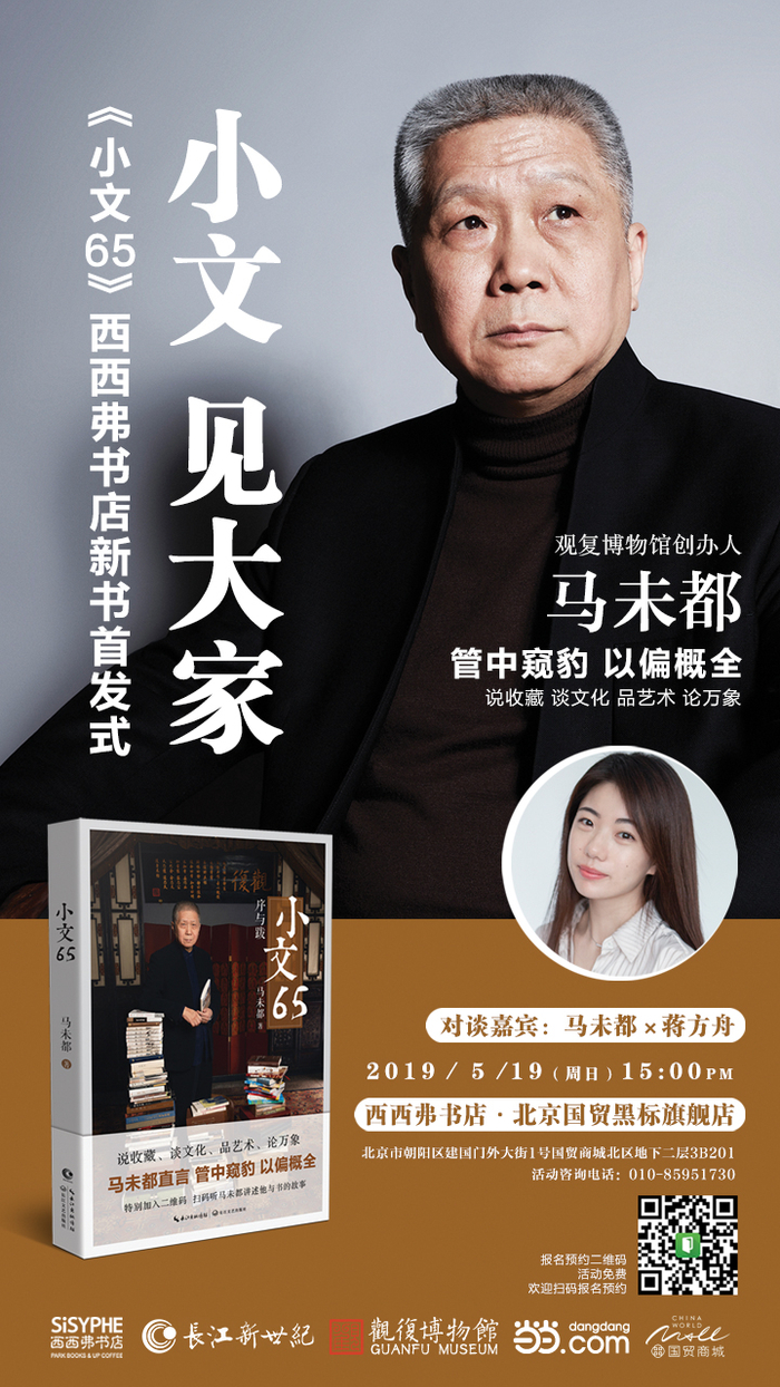 《小文65》精选了马未都近15年来所写的序跋文章,内容涉及收藏、文化、艺术、建筑、文学、社会等方方面面。每篇序跋小文虽然不长,寥寥数语,却往往可以将该领域的历史梳理一番,点明全书精髓,见解独到,足见一位博采众长的文化大家的学识和功力。5月19日,一起和两位嘉宾聊一聊《小文65》的独到之处。