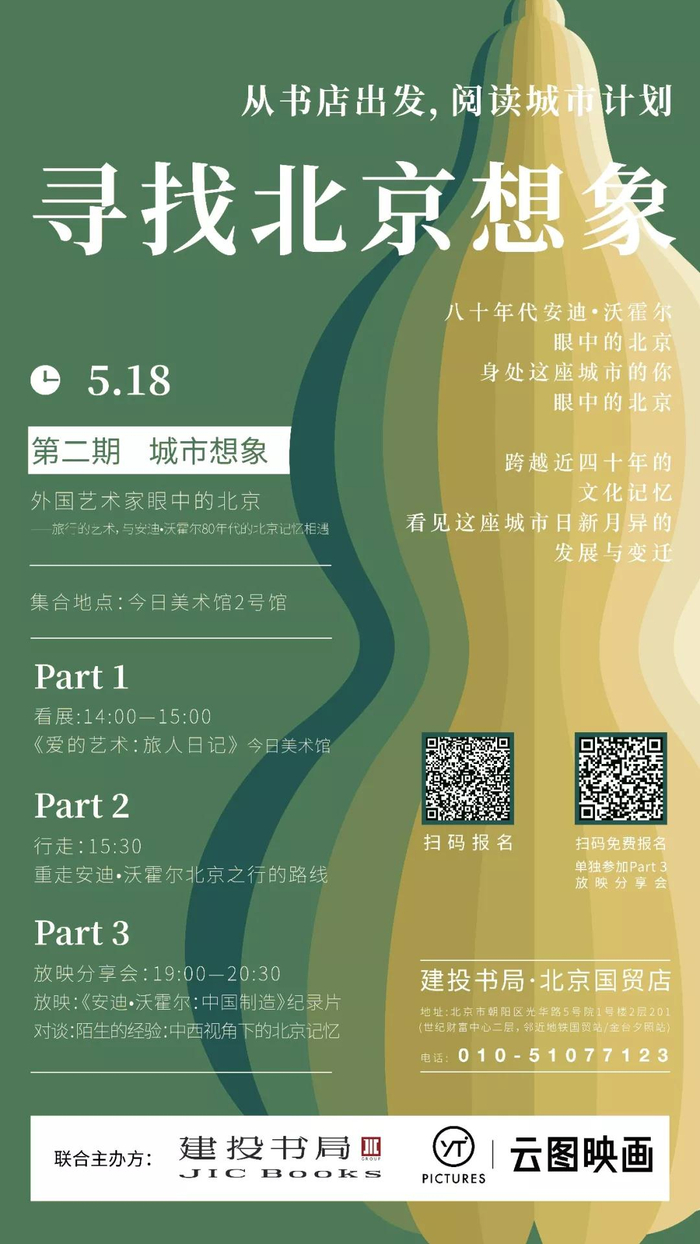 “寻找北京想象”第二期由建投书局与云图映画联合推出。此次旅行从云图映画IP大展《爱的艺术:旅人日记》出发,抽取出安迪·沃霍尔1982年珍贵而少为人知的北京旅行故事,带你通过看展、微旅行、纪录片放映和对谈沙龙的方式,走近一个真实、可爱的安迪·沃霍尔,并透过他的眼光,跨越近四十年的文化记忆,看见北京日新月异的发展与变迁。