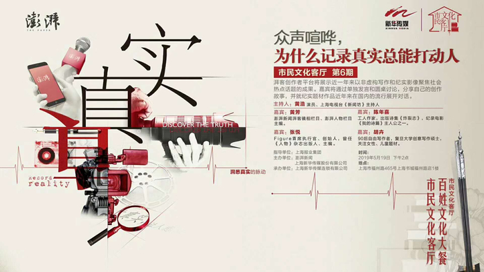 5月19日,由上海报业集团与旗下上市公司新华传媒共同打造的文化品牌“市民文化客厅”,将于上海书城举办第6期活动——澎湃新闻《众声喧哗,为什么记录真实总能打动人》。来自澎湃旗下“湃客”创作平台的主编和热门作者将讲述他们的创作故事,展现非虚构写作与影像的独特魅力。