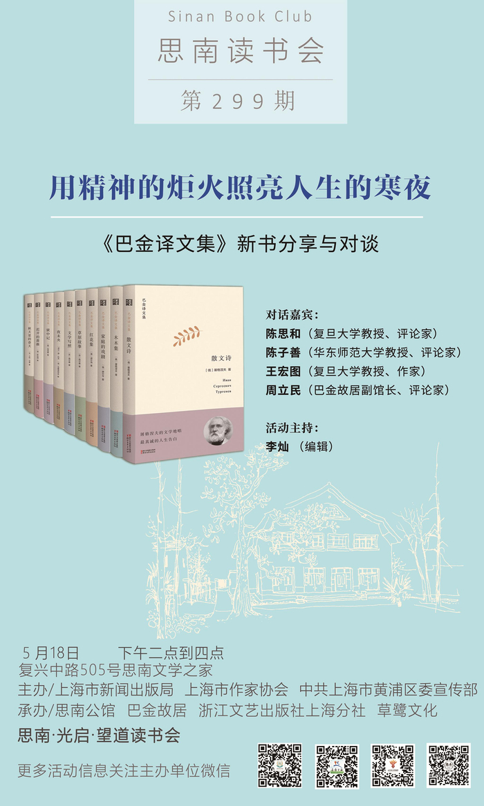 本次活动我们邀请到了复旦大学教授、著名评论家陈思和,华东师范大学教授陈子善,复旦大学教授王宏图,以及本套《巴金译文集》的策划人、巴金故居常务副馆长周立民,一起就这套《巴金译文集》的出版、巴金的翻译工作,以及这套书中的文学作品展开对谈。通过这次对谈,也许你会了解为什么屠格涅夫的《木木集》堪称世界短篇小说中的瑰宝,《草原故事》为什么是巴金眼中真正的短篇精品,斯托姆的“诗意小说的巅峰之作”又有什么独特的魅力……以及作为翻译家的巴金,这些外国文学作品又是如何成为他精神的炬火,照亮人生的茫茫寒夜。
