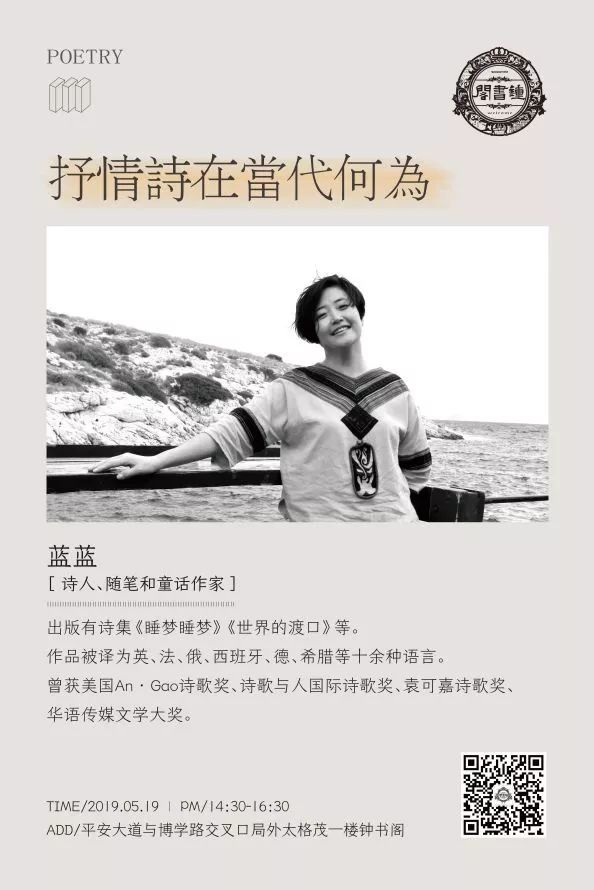 我们邀请到了著名诗人、随笔和童话作家蓝蓝来到郑州局外太格茂钟书阁书店,就“抒情诗在当代何为”这一主题,来和大家进行分享与交流。活动最后,蓝蓝老师将携自己最新出版的诗集《世界的渡口》,进行现场签售。