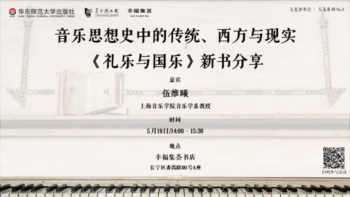 5月19日,上海音乐学院音乐学系教授伍维曦将在幸福集荟书店与读者们分享从古典语境中的“天下中国”向近现代意义上的“民族中国”演进的宏大背景中,音乐思想家们的具体活动及其主要看法。