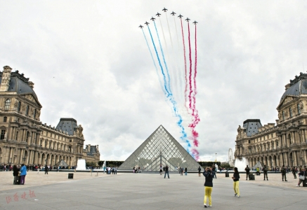 4、2012年7月14日,在法国巴黎卢浮宫的玻璃金字塔上空,“法兰西巡逻兵”飞行表演队在国庆阅兵式上进行飞行表演。由贝聿铭设计的卢浮宫玻璃金字塔入口于1989年投入使用。