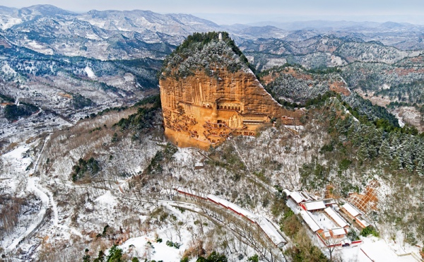 甘肃天水麦积山,自后秦至明清一直在开窟造像。几近垂直的崖壁上,大小龛像密如蜂房,初冬雪后更显庄严。摄影/王金