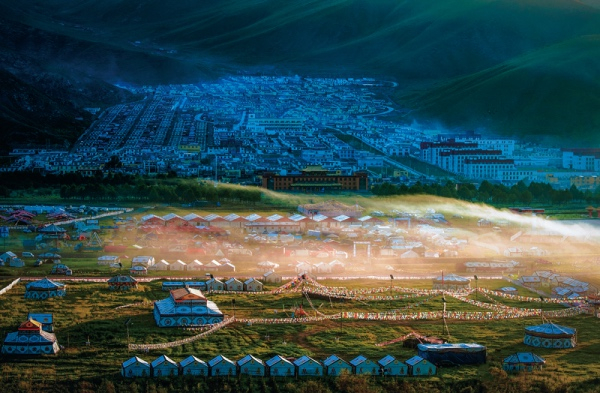 玉树赛马会是青海规模最大的藏族盛会。玉树的康巴藏族有赛马习俗,无论是敬神祭祖还是结婚宴请等,都要举行赛马。图中表现的就是赛马会期间,草原上搭满帐篷的情景。摄影/官群