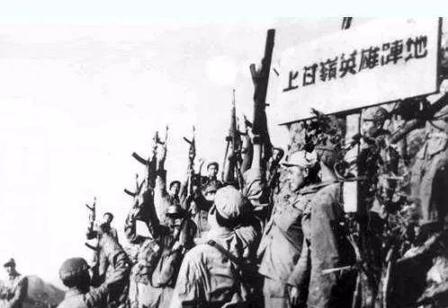 志愿军战士在上甘岭英雄阵地欢庆胜利。