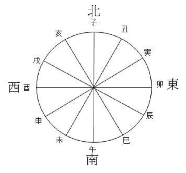 这个“地平圈”十二支刻度与东南西北这些方位的对应关系,可图示如下:
