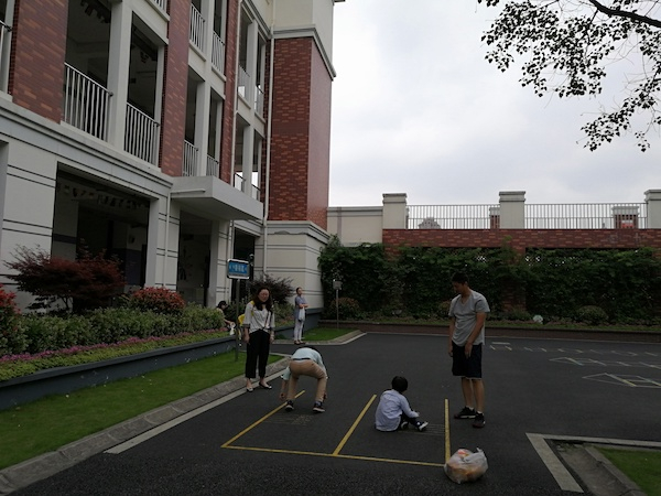孩子和家长们在等待的间隙在校园场地上做游戏