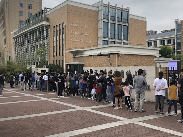 5月18日一早八点半,上海福山唐城外国语小学门口就排起了长龙,家长带着孩子们在校门口井然有序地等待着叫号,接着进校验证报名信息。排队的家长和孩子们表情都十分轻松,有几个孩子在校门口的广场上欢快地奔跑,丝毫没有紧张的情绪。