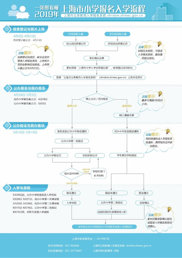 特别提醒:5月20日起,对公办小学第一批通过验证的适龄儿童陆续发放入学告知信息,民办小学陆续发送录取确认信息。如家长不选择报名公办小学,又未被民办小学面谈后录取的,根据第一批公办小学验证和已分配入学的实际情况,以上海户籍人户一致优先、同类排序靠后(比如同属人户一致类,即排在此类靠后)为原则,由相关区教育行政部门按照当年度区、校招生政策和细则安排入学。6月15日-6月16日为全市公办小学第二批验证日。