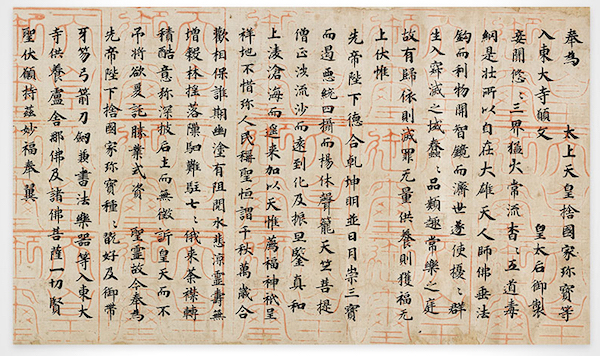 这是天平胜宝8年(756)6月21日,光明皇后将圣武天皇的遗物、六百数十件物品献给东大寺大佛时的目录,18张麻纸上的墨色仍鲜艳醒目,且全体盖有“天皇御玺”的印章。卷首和卷末,光明皇后写下了对圣武天皇的悼念和对亡夫的思念。目录最后记为“追感疇昔、触目崩摧”,这是皇太后看到太上天皇遗爱之物,想起与生前天皇发生的各种事情而感到心碎。