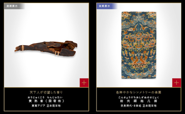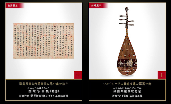 圣武天皇光明皇后有渊源的宝物、华丽的染织美术、名贵香木的世界、正仓院的琵琶、跨时代工艺美术的共演、宝物的保护。