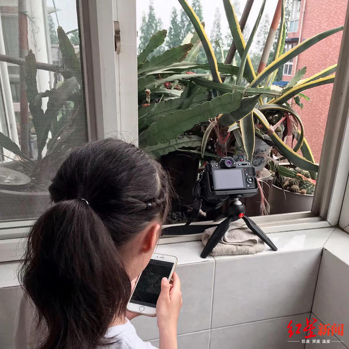 雏鸟吃些什么东西?鸟妈妈如何喂食?看到鸟儿一天天成长,女儿不断发出疑问。18日,刘伟再次带着女儿来到父母家中,为了不惊扰到鸟儿,刘伟把相机用三角架架住,人回到客厅里,通过wifi把相机拍到的画面传回,这样既能记录鸟儿喂食的过程,又不会打扰到它们,“四五分钟左右就飞回来一次,叼着蚯蚓喂给雏鸟。”