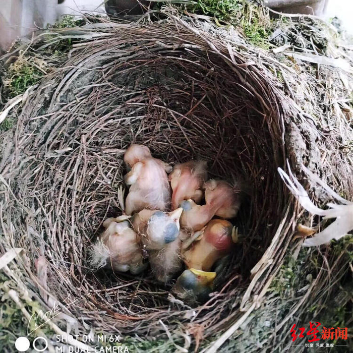 隔了一周,刘伟的父母回到成都市金花镇附近的家中,生活阳台上传来叽叽喳喳的鸟叫声,走近一看,原来是一只野生乌鸫(dōng)在此安了家,窝里还有6枚鸟蛋。为了不惊扰到它们,刘伟父母不再在家里炒菜做饭,为乌鸫提供一个安静的孵化环境。