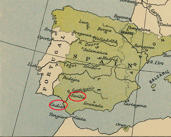 卡洛斯五世时期的西班牙地图中的塞维利亚和加迪斯
