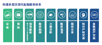 拥有证券、保险、投资基金(种子、VC、PE和并购等基金)、融资担保、小额贷款、融资租赁以及股权交易、知识产权交易、金融资产交易等多层次现代金融服务体系。