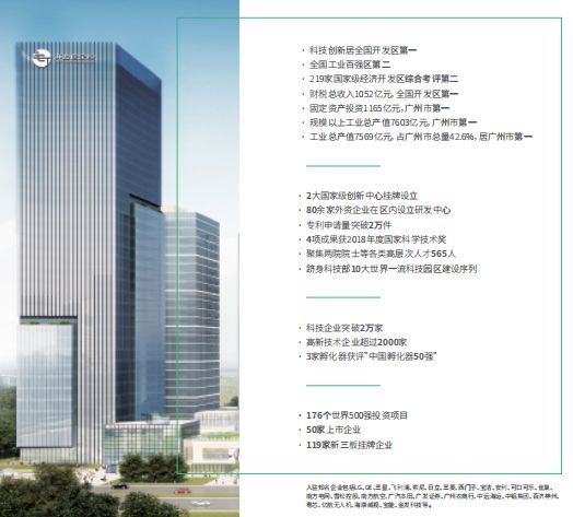 它背靠的是粤港澳大湾区中的广州开发区,有着优质的区域背景,为发展打下基础:科技创新居全国开发区第一、区内科技企业突破2万家、176个世界500强投资项目、50家上市企业…