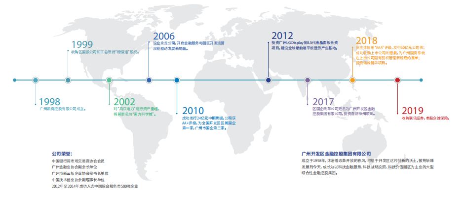 广州开发区金融控股集团有限公司(原广州凯得控股有限公司,以下简称“开发区金控”)成立于1998年,二十几年的历程在上图中一一显现,是广州开发区管委会为拓展资本经营和资产经营、优化产业结构、加速开发区经济发展而设立的国有独资有限责任公司。