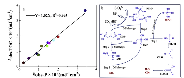 图3 (a)紫外-过硫酸降解体系中磷酸盐生成速率与总有机碳降解速率的关系;(b)NTMP降解路径