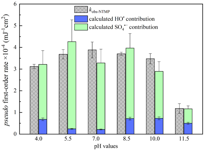 然而,目前经济高效的有机膦酸盐去除技术还较为欠缺。中国科学院测量与地球物理研究所环境与灾害监测评估湖北省重点实验室副研究员王智联合加州大学河滨分校副教授Haizhou Liu团队研究了紫外光/过硫酸盐氧化体系对一种典型有机膦酸盐(Nitrilotris-methylenephosphonic acid, NTMP)的降解过程与机制。结果表明,紫外光/过硫酸盐能有效地降解NTMP,反应遵循伪一级动力学。中性条件有利于NTMP降解,在高碱性条件下(如pH值11.5)降解受到明显抑制,这主要是由于硫酸盐自由基SO4`-浓度降低所致。利用化学探针精密测量技术,首次定量了反应体系中两种主要自由基SO4`-和HO` 与NTMP反应的二级动力常数分别为(2.9 ± 0.6) × 107 M-1s-1和(1.1 ± 0.1) × 108 M-1s-1。SO4`-对NTMP降解起主要作用(62%-95%),在pH 4 ~ 11.5之间,SO4`-的稳态浓度比HO` 高11-54倍。在实际含有机膦酸盐的废水中,氯化物和碳酸氢盐的存在会显著影响NTMP的降解速率。通过降解产物的测定,研究人员确定了NTMP的降解路径。经济性比较表明,紫外光/过硫酸盐氧化体系降解NTMP的费用仅为紫外光/双氧水降解体系的5%-45%。该研究表明,紫外/过硫酸盐氧化法是一种经济高效的有机膦酸盐类污染物去除技术,可用于类似废水的深度处理与回用,在当前水生态环境保护与水资源回用中发挥重要作用。