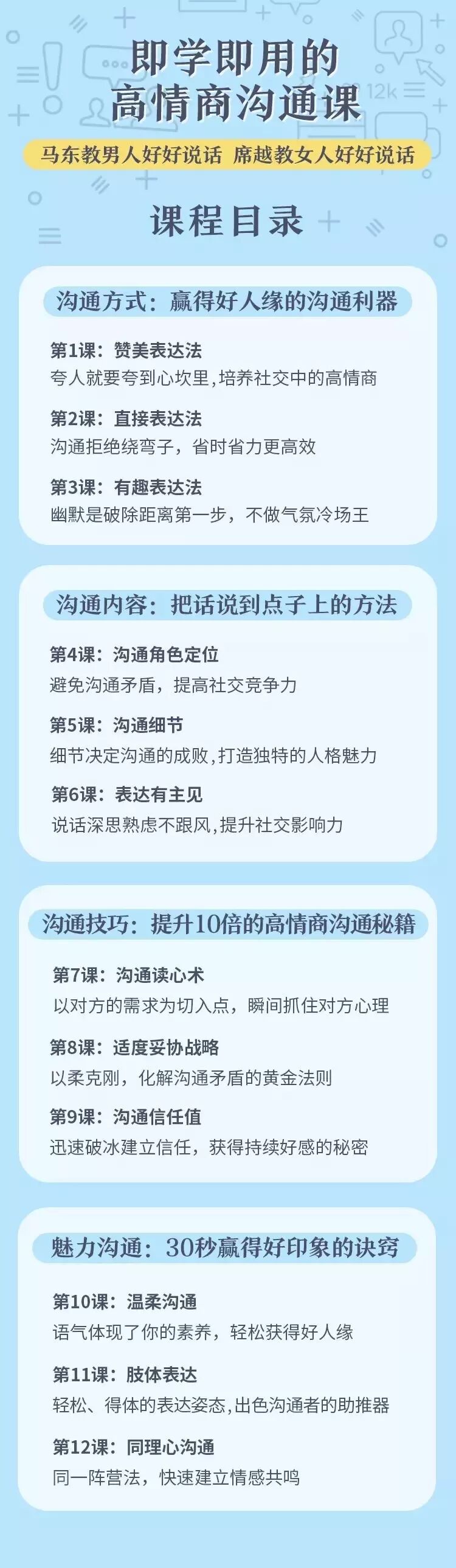 我已经把多年实战沟通和教学经验,总结成12节视频课,历经3000+小时精细打磨,最终呈现给你。