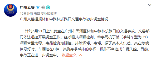 当天下午15时05分,广州公安发布最新通报《广州交警通报林和中路林乐路口交通事故初步调查情况》,原因是涉事司机在等候信号灯时,侧身拿后排水杯,操作不当造成车辆失控。