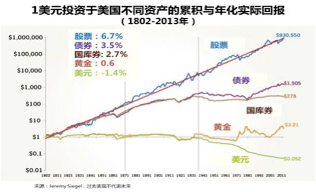 大家肯定会问,投资什么?我们看看海外的经验,长期而言哪一类资产是最值得投资的?还是股票类资产。假如美国股票市场出现时投资1块钱,到2013年就变成了将近100万。它的实际回报(扣除了通胀以后)每年为6.7%,比所有的资产类别回报都要高,房地产其实远远比不上股票。