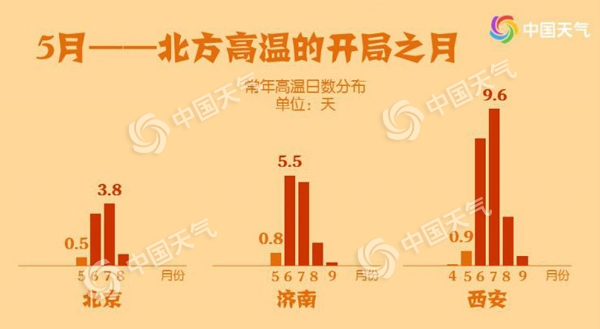 北方为何热得如此“高调”?其实从常年来看,北方5月热得就是比较“高调”,主要大城市高温日数比江南多,极端最高温也高出许多。比如北京、天津、石家庄、郑州等地5月都曾出现超过40℃的高温,其中北京最高曾达到41.1℃,而上海最高只有35.5℃,长沙、杭州、南京、江西、广州均在36℃左右。