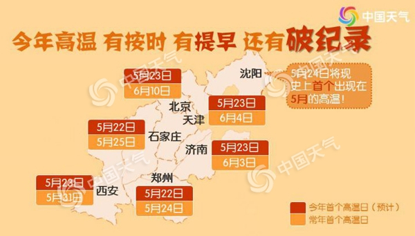 具体来看,22日郑州、石家庄将争夺今年北方省会的首个高温,北京、天津、济南、西安23日作为高温第二波。中国天气网气象分析师王伟跃表示,常年华北、黄淮一带的高温季,就是在5月下旬-6月上旬开启,总的来说,今年华北、黄淮来的稍偏早,但并不意外。意外的是沈阳,5月24日可能冲到36℃,一旦兑现,将打破当地5月最热纪录(1979年5月28日34.3℃),以及最早高温纪录(原纪录2001年6月3日36℃)。