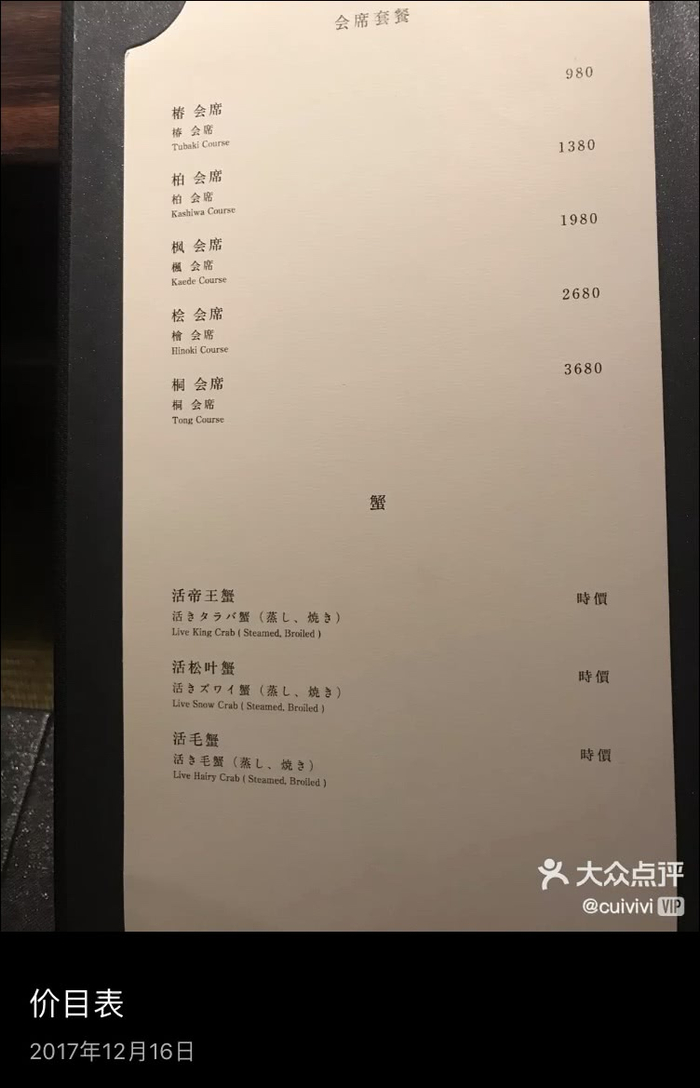 而在消费者2017年12月上传的菜单中,同样的“桐会席”套餐的价格则高达3680元。