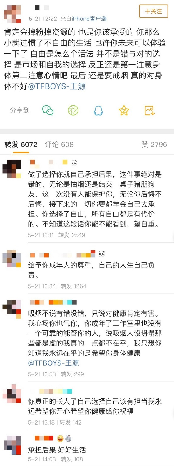 除了一部分因为镜头前榜样好青年的形象轰然坍塌、心碎脱粉的粉丝,更多的王源粉丝态度还是中肯的——室内抽烟错了就是错了,不洗白;掉粉掉资源,自己造成的恶果自己承担;劝告戒烟,合理选择解压方式。