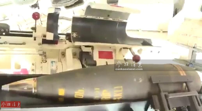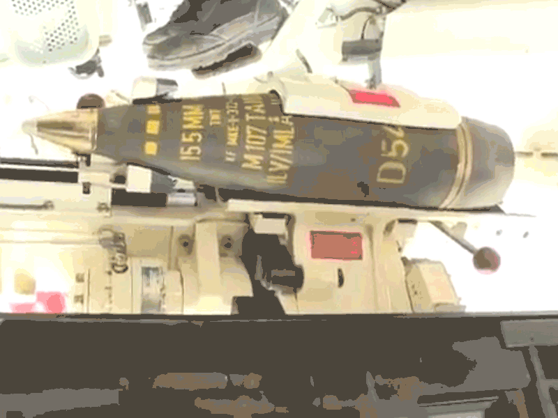 半自动装填系统将155毫米炮弹放到输弹器上,并将炮弹推入炮尾的动态图。