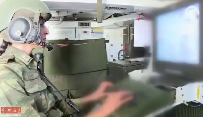 这辆可能是专用指挥车,内部空间比其他火炮要宽敞,女军官可能在终端上进行作战计划的制订工作。设备细节出于保密需要,进行了模糊化处理。