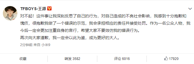 21日中午,王源通过个人微博致歉: