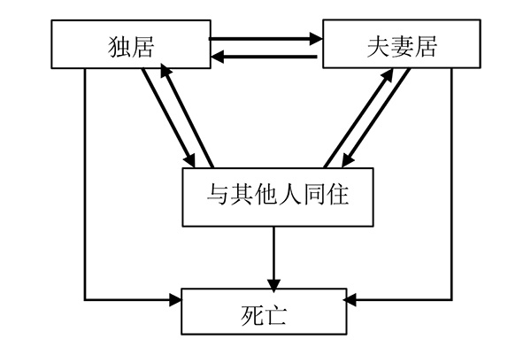 本研究的数据来源为2011~2013年中国养老与健康追踪调查(CHARLS),该调查由北京大学国家发展研究院开展,覆盖了全国150个县、区的450个村、居。本研究选取了60岁及以上(2011年)的样本,共计7334人,主要使用了调查中基本人口信息、家户和家庭信息等调查内容。本研究的空巢老人指的是身边无子女或其他亲属一起生活的60岁及以上的老年人,包括仅与配偶共同居住和因丧偶、离婚、未婚等原因而独居的老人。根据研究目的,本研究将老年人居住状态划分为独居、夫妻居、与其他人同住,期末则增加“死亡”状态,除死亡状态外,居住状态之间可以相互转换(见图1)。