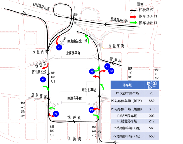目前进入南站地区的车辆大部分来自绕城公路方向,由江南路、博爱街、六朝路组成的围绕整个南站站区的环形道路仅能逆时针单向行驶,驾驶人将依次路过P5、P4、P6、P7、P3、P2等停车场。