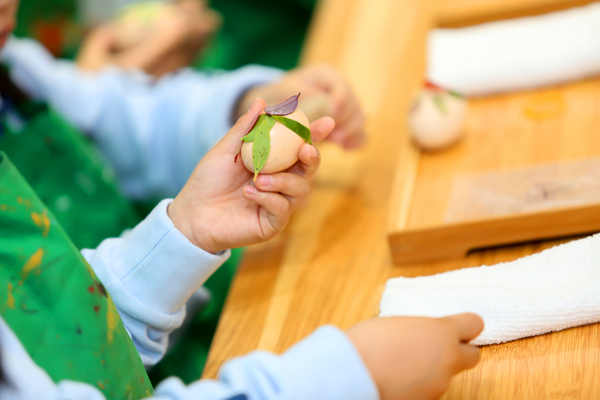 前不久刚上完《立夏染蛋》的一(4)班学生、来自瑞典的Nicholas用中文说:“我很喜欢上工坊课,我们要把树叶沾上水,再贴到蛋壳上,用皮筋扎紧,要绑得很紧很紧,不能移动,你不能着急,这样才能得到一个美丽的蛋。”五(2)班学生张静茹说:“我在工坊里最开始学会的就是‘静心’。每次老师一摇铃,我一听到铃声,就能静下来。现在做别的事情,需要静心时,我也能很快就静下来。”