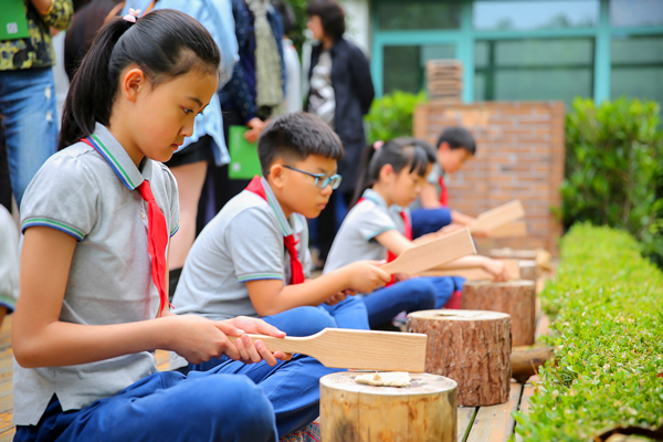 为了配合中国文化主题,宋庆龄学校特设了一个中国传统文化主题的教室——工坊传习馆。步入工坊传习馆,你就会被浓浓的中国味道所“包裹”,有树皮脉络清晰可见的手工纸,有天然食材染的布料,有墨韵芬芳的书法作品,还有制作传统手工纸和草木染的工具。学生们可以在这里体验《立夏染蛋》,也可以学习《传统造纸》。信息技术教师陈伟说:“我们会和孩子一起用一年的时间学造一张保留唐代工艺的手工纸、染一块布。技艺学习不是最终目的,我们一起求真、求慢、求拙、求难、求异,一起体验礼仪、美学和匠心。”