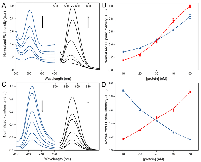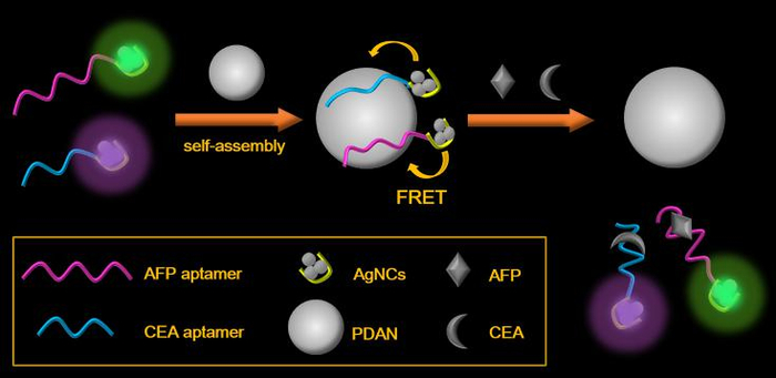 该项工作中,首先引入聚多巴胺纳米球@银纳米簇(PDAN@AgNCs)体系,并使用不同的DNA模板合成具有不同荧光发射性质的银纳米簇,模版的另一端分别包含针对不同肿瘤标志物的适配体序列。单链DNA序列可以通过π-π堆积吸附在聚多巴胺纳米球的表面上导致银纳米簇的荧光猝灭。在存在相应的肿瘤标志物时,形成的适配体/靶标蛋白复合物可以从聚多巴胺纳米球的表面释放出来,游离的银纳米簇发射的荧光信号可用于指示相应肿瘤标志物的浓度。随着肿瘤标志物浓度的提高,相应的荧光发射变强,其浓度与荧光强度呈正相关。