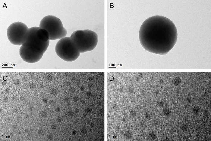 图2 聚多巴胺纳米球(A,B)与不同银纳米簇(C,D)的透射电子显微镜表征