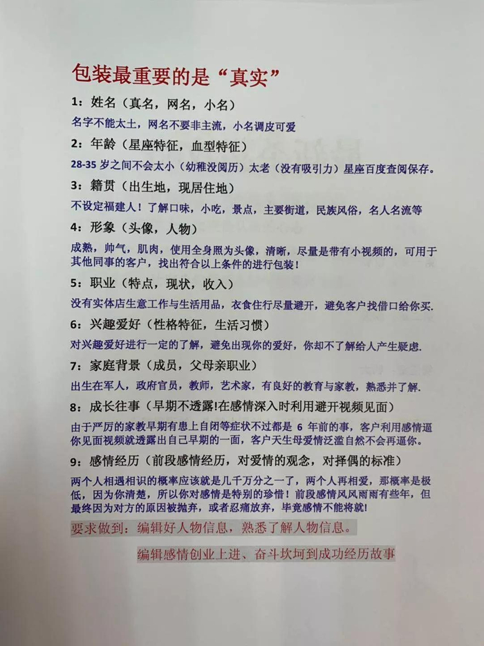 要想与别人建立恋爱关系,你必须得先把自己包装成其他人可以接受的样子。因此,我要求每一个新员工,首先要学会包装自己。给员工的话术中,也列明了包括如何设置自己的昵称、年龄、籍贯、形象、职业、兴趣爱好等9种具体操作办法。