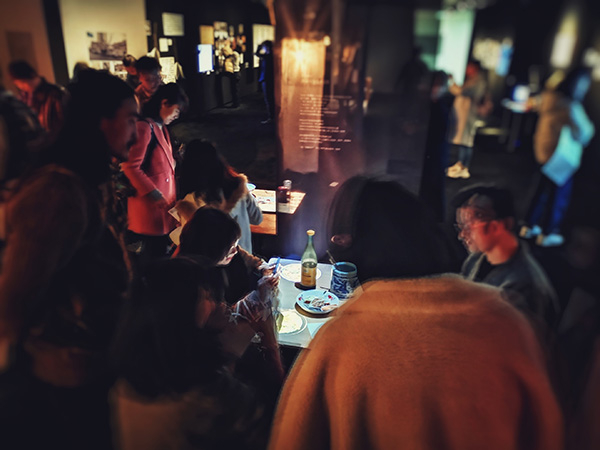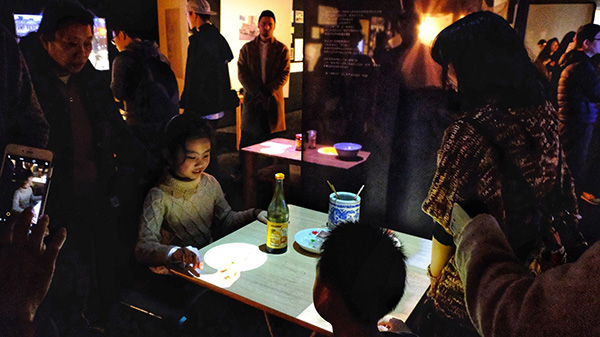 展览期间,我们看到小朋友围坐在桌旁,指点桌上动态变化的菜品,眼里闪动欣喜与好奇,有人拿起筷筒里的筷子佯装进食拍照,有人指着桌上的炸猪排和泰康牌辣酱油感慨儿时的味道,还有人驻足仔细聆听小馆上空的音频对话。