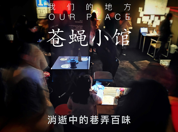 第12届上海双年展的城市项目“你的地方”中,“我们的地方”展览期间,我们就在PSA展厅里布置了这样一家临时的苍蝇小馆,从诸多沪上小馆那里“众筹”来的桌子椅子餐具被重新组合,并通过投影和音响设备将嘈杂的点菜声、交谈声和菜品刚出锅时的一缕蒸汽借进了展厅。