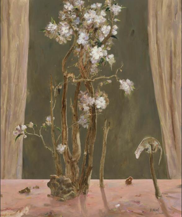 参展艺术家王朝刚的作品以舞台化的方式处理传统花卉等物象,在画面中加入荒诞、有戏剧感的场景。《镜花缘》本身就是一部充满荒诞的小说,《镜花缘》系列作品当画面中出现蜥蜴、小怪兽等物象并不显得过分突出和激烈。