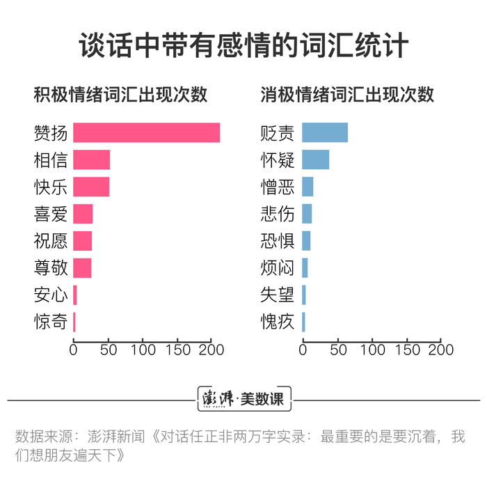 使用大连理工大学的《情感词汇本体表》,来匹配任正非谈话中所出现的571个带有情感色彩的词汇后,我们发现谈话中的褒义词汇出现数量,是出现贬义词汇数量的两倍左右。而中性词汇数量与褒义词汇数量相近。