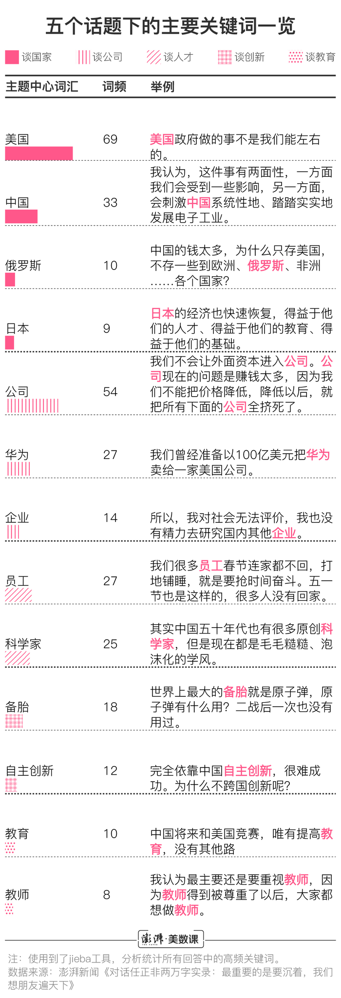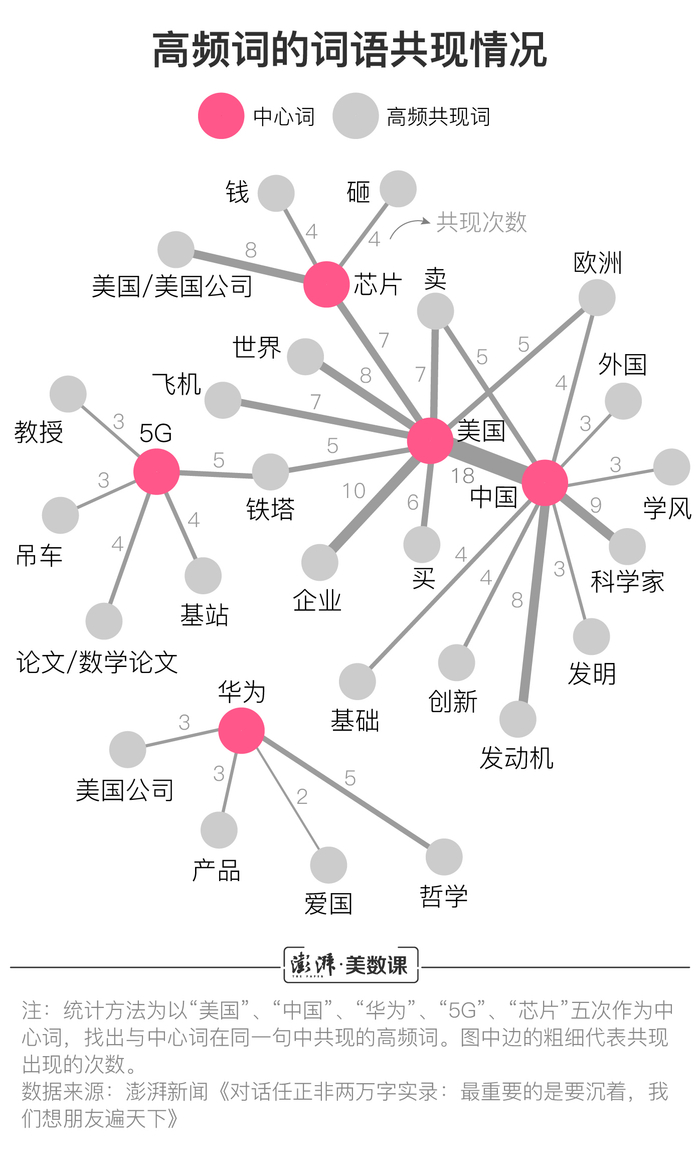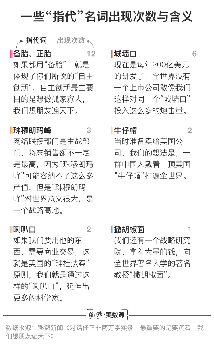 澎湃新闻(www.thepaper.cn)通过整理任正非接受采访中所有69个回答(不含记者提问问题),通过文本分析手段,总结了回答中的主要内容。