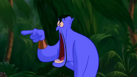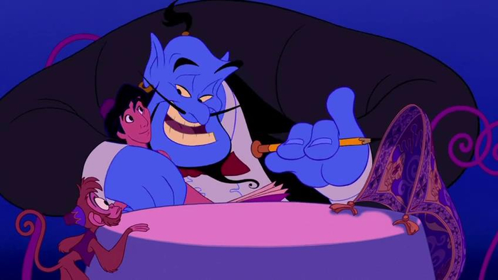 二十几年前的这部《阿拉丁》动画片,即使放在今天看也依旧妙趣横生。里面最精彩的莫过于这个蓝胖子神灯精灵,在山洞里一出场便吧啦吧啦各种饶舌,忽变身成卡拉OK忽变身成侍者甚至还变成空姐,被阿拉丁戏耍之后下巴掉下来然后又变成一只羊,这一段实在让人佩服当年迪士尼的肆意挥洒、才华横溢、不拘一格。